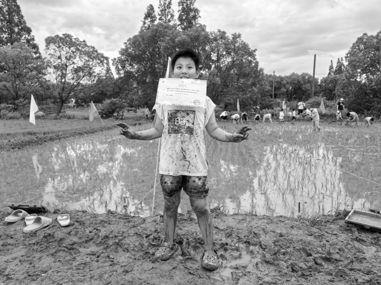 回到计维拍下照片的那天——6月,插秧日。天空阴沉,乌云低垂。奉贤区西渡学校四年级学生万家怡早早醒来,内心忐忑。她担心因下雨活动取消——她期待这场插秧好久了。在她的想象里,农田是课本插图上那样:方方正正,青山环绕,干净美好,像被精心修剪过的绿色棋盘。
