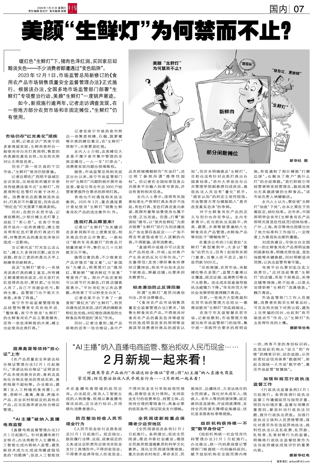 暖红色“生鲜灯”下,猪肉色泽红润,买回家后却黯淡失色——不少消费者都遭遇过“变色陷阱”。 2023年12月1日,市场监管总局新修订的《食用农产品市场销售质量安全监督管理办法》正式施