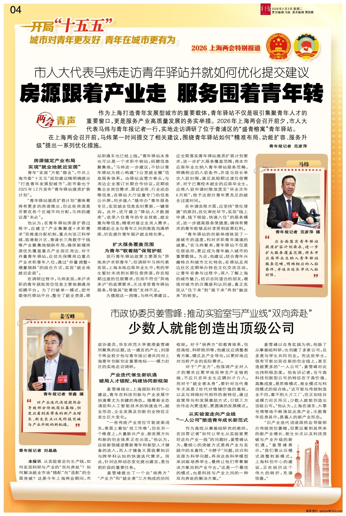 - 房源跟着产业走 服务围着青年转 作为上海打造青年发展型城市的重要载体,青年驿站不仅是吸引集聚青年人才的重要窗口,更是服务产业高质量发展的务实举措。2026年上海两会召开前夕,市人大代表马炜与青年报记者一行,实地走访调研了位