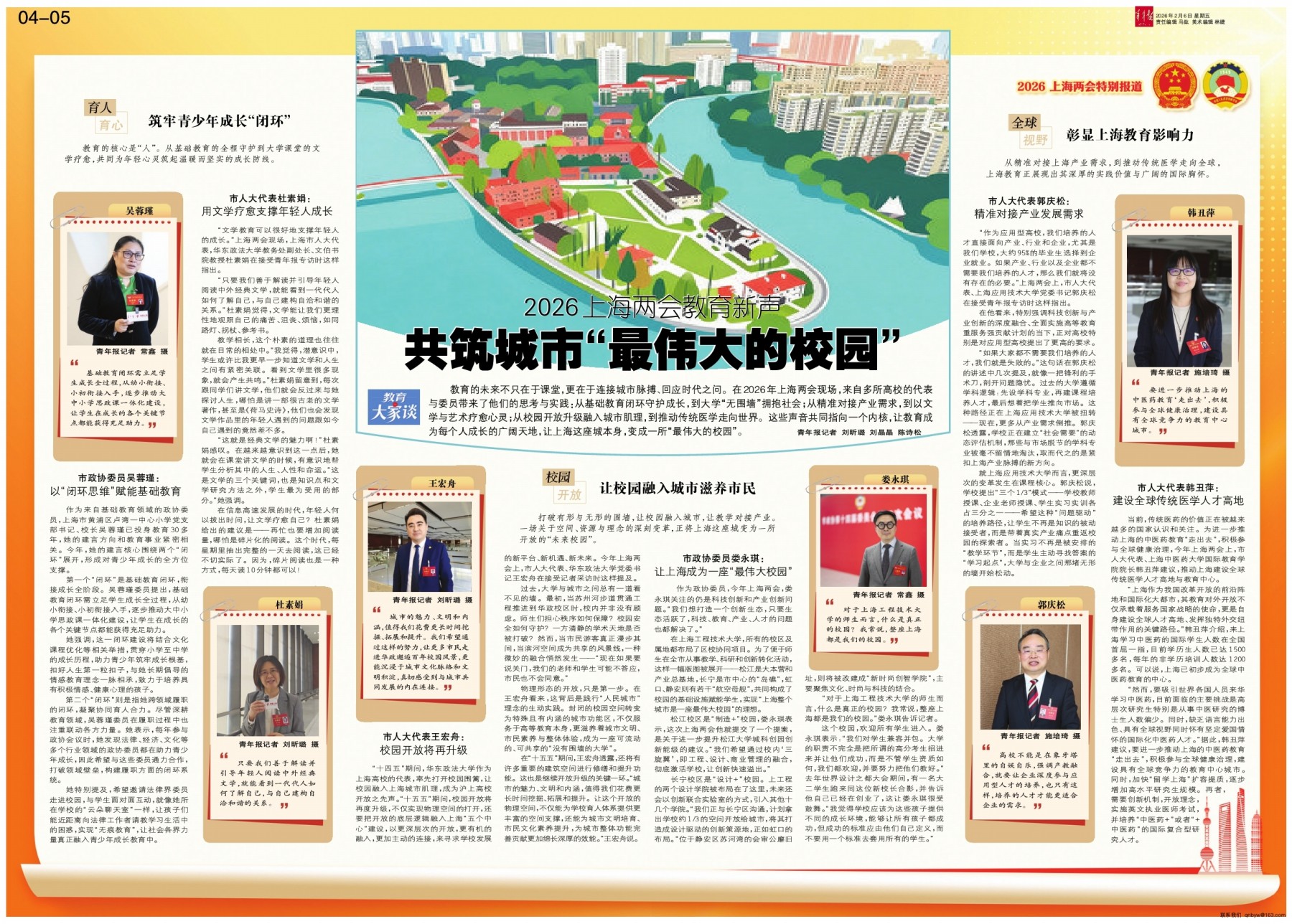教育的未来不只在于课堂,更在于连接城市脉搏、回应时代之问。在2026年上海两会现场,来自多所高校的代表与委员带来了他们的思考与实践:从基础教育闭环守护成长,到大学“无围墙”拥抱社会;从精准对