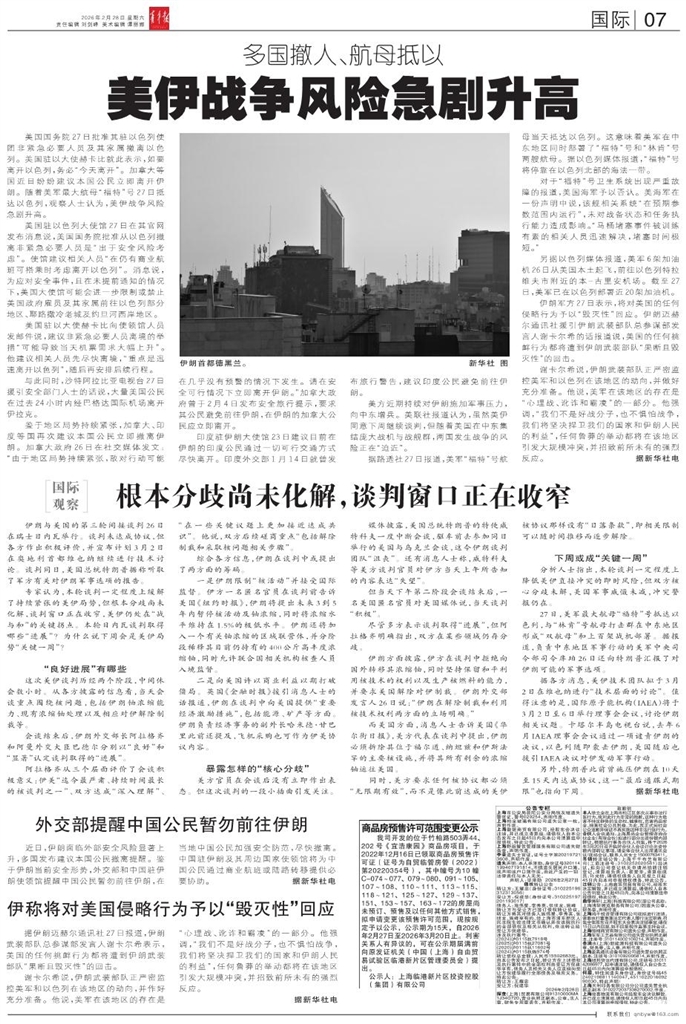 鉴于地区局势持续紧张,加拿大、印度等国再次建议本国公民立即撤离伊朗。加拿大政府26日在社交媒体发文:“由于地区局势持续紧张,敌对行动可能在几乎没有预警的情况下发生。请在安全可行情况下立即离开伊朗。”加拿大政府曾于2月4日发布安全旅行提示,要求其公民避免前往伊朗,在伊朗的加拿大公民应立即离开。