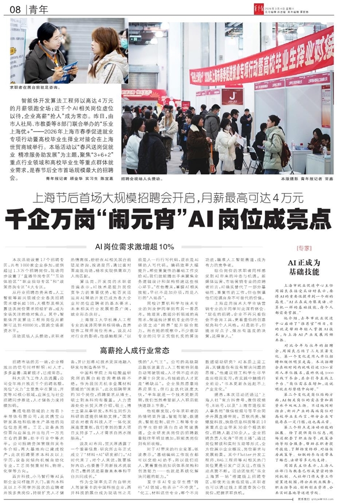 智能体开发算法工程师以高达4万元的月薪领跑全场;近千个AI相关岗位虚位以待,企业高薪“抢人”成为常态。昨日,由市人社局、市教委等8部门联合举办的“乐业上海优+”——2026年上海市春季促进就业专项