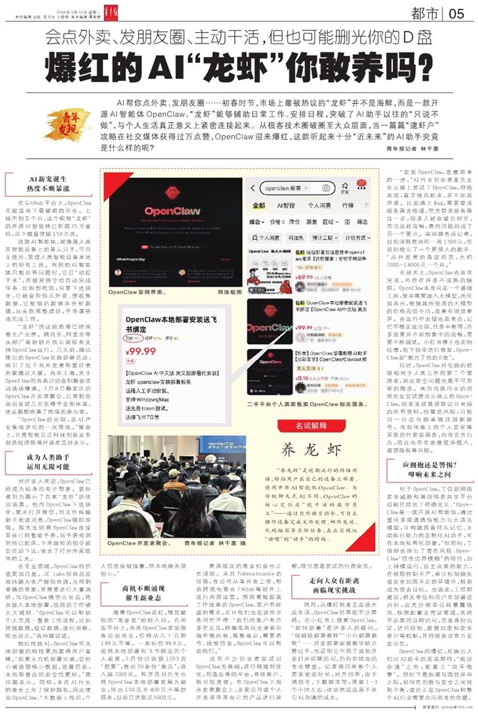 AI帮你点外卖、发朋友圈……初春时节,市场上最被热议的“龙虾”并不是海鲜,而是一款开源AI智能体OpenClaw。“龙虾”能够辅助日常工作、安排日程,突破了AI助手以往的“只说不做”,与个人生活真
