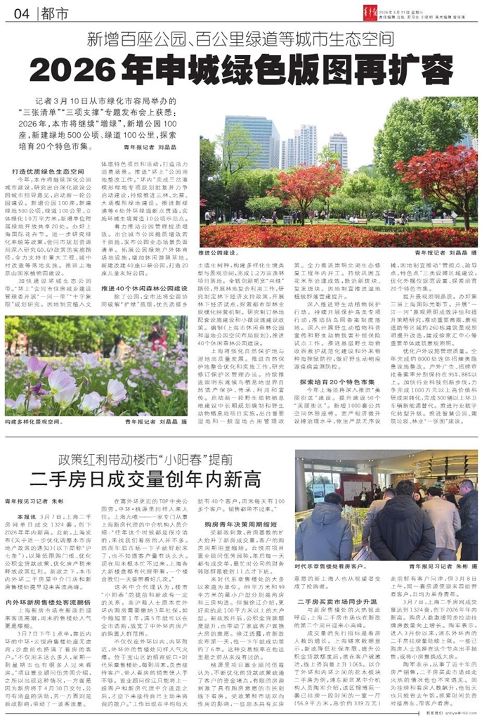 - 2026年申城绿色版图再扩容 记者3月10日从市绿化市容局举办的“三张清单”“三项支撑”专题发布会上获悉:2026年,本市将继续“增绿”,新增公园100座,新建绿地500公顷、绿道100公里,探索培育20个特色市集。青年报记者