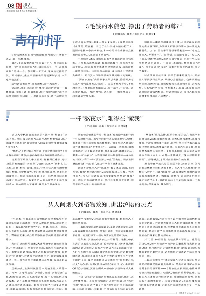 - 5毛钱的水煎包,挣出了劳动者的尊严 【文/青年报·青春上海评论员 陈嘉音】 5毛钱的水煎包为何能拴住全网的心?老板不语,只是一味地揉面。 最近,上海有家店被“全网催开门”。那是浦东新区的一家“河南水煎包”店,胡辣汤3元一份,