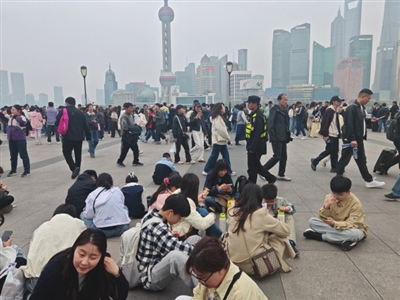 傍晚五点半,记者来到了外滩景区。在亲水平台上,景区的板凳上已挤满休息的游客。很多游客由于找不到空闲的位置,只能席地而坐。现场的保安告诉记者,从昨天开始,外滩的人流量就明显增多。“我们一家人是从苏州过来的,因为小孩子放春假了,所以我也请了半天假,陪小孩出来玩玩。”吴女士说,得知今年要放春假之后,孩子就和朋友约好了假期要来上海玩,外滩、东方明珠、迪士尼……这些景点都是他们此行的必经之地。“当然也不能一直玩,我们打算清明节的时候就回去写作业了,孩子作业还没写呢!”吴女士笑着说。