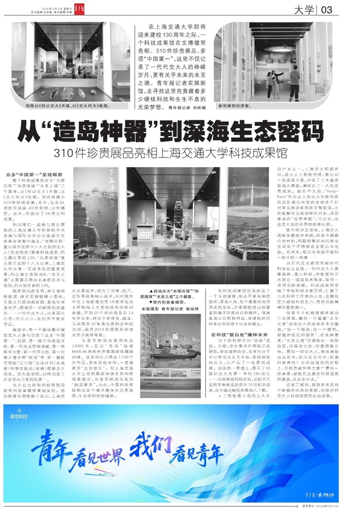 在上海交通大学即将迎来建校130周年之际,一个科技成果馆在文博楼里亮相。310件珍贵展品、多项“中国第一”,这里不仅记录了一代代交大人的峥嵘岁月,更有关乎未来的未至之境。青年报记者实探新馆,去寻找