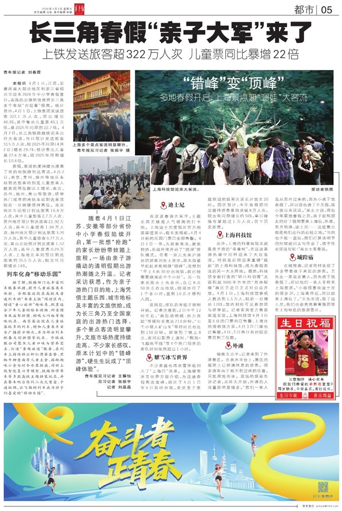 - 长三角春假“亲子大军”来了 青年报记者 刘春霞 本报讯 4月1日,江苏、安徽两省大部分地区和浙江省绍兴市迎来2026年中小学春假首日,高涨的出游热情使得长三角多个车站“含娃量”极高。统计显示,4月1日,上铁集团发