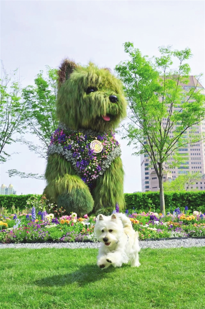 站在苏河湾中心绿地天桥上,远远就能望见一只五米多高的“西高地小狗”,浑身毛茸茸的,穿着蓝白相间的花背心,矗立在花丛中。这只用真实的植物一株一株“种”出来的“潦草小狗”是静安分会场“花漾萌宠乐园”的核心景观之一。在一旁的枯木桩上,还伫立着动画《狮子王》中丁满的原型——狐獴造型景观。