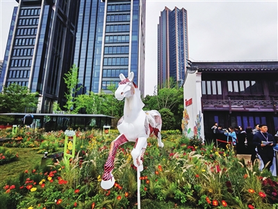 记者看到,“纵马踏花向自由”主题点位以2026丙午红马年为文化锚点,设计提取了古“马”字构建动线骨架,以红橙色系花海为基底、白色奔马为精神图腾,借三段式花海与声景营造层层递进的情感体验,打造兼具花园疗愈与秀场属性的沉浸式空间。