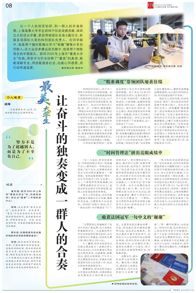 从一个人的刻苦钻研,到一群人的并肩突围,上海海事大学学生邱坤不仅是成绩亮眼、保研北大的顶尖学霸,更是带领团队发表8篇论文、斩获多项国际大奖的科创团队负责人。在同学眼中,他是那个随时能掏出学习“秘籍