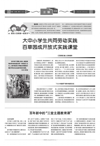 上海中医药大学党委副书记、副校长孟煜介绍,学校高度重视将劳动教育融入思想政治教育的全过程,加快劳动教育进中小学、进课堂、进园区、进社区。目前,学校与10余所中小学开展长效合作,累计开展劳动教育主题活动百余场,覆盖大中小学生数千人,形成了具有中医药特色的“五育并举”劳动教育模式。