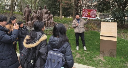 本次巴士研学课程是沪上三所共建高校联合举办的一次研学活动。参加研学的大学生来自多个专业,研究生则来自马克思主义理论专业,大家在上海机器工会旧址旁的工人雕塑前驻足,当年工人在这里提出的“谋本会会员的利益,除本会会员的痛苦”发起会宗旨音犹在耳。他们在五卅纪念雕塑下合影,当年工人在这里声讨帝国主义的身影叠影成碑。