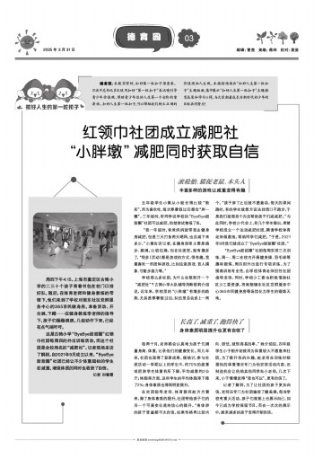 在社团指导老师、体育教师赵方方看来,除了身体素质的提升,社团带给孩子们的另一个可喜变化是自信心的提升。“身体胖的孩子普遍都不太自信,如果性格再比较内向、胆怯,就很容易自卑。”她介绍说,四年级学生小于刚开始就因为体重较大不愿意来社团,为了提升他的兴趣,赵老师在训练时根据他的体重情况专门为他安排活动内容,还制造机会让他给其他同学当小老师,几次下来,小于慢慢觉得“我也可以”,更有自信了。