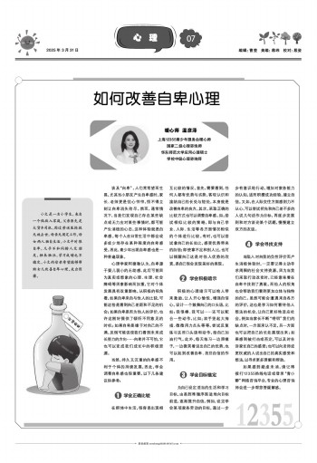 谈及“自卑”,人们常常望而生畏,尤其当小朋友产生自卑感时,家长、老师更是忧心忡忡,恨不得立刻让自卑消失殆尽。然而,通常情况下,当我们发现自己存在某些缺点或无力应对某些事情时,都可能产生消极的心态,这种体验就是自卑感。每个人在日常生活中都会或多或少地存在某种程度的自卑感受。因此,青少年出现自卑感也是一种普遍现象。