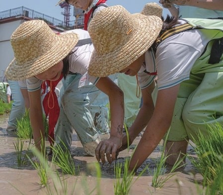 静安区永兴路第二小学是一所位于市中心的学校。这所学校的规模不大,但在寸土寸金的校园里,却藏着一片不小的田地。最近,田里的水稻正在慢慢变黄,学校便将劳动课程与实践结合,让学生在真实情境中探究。